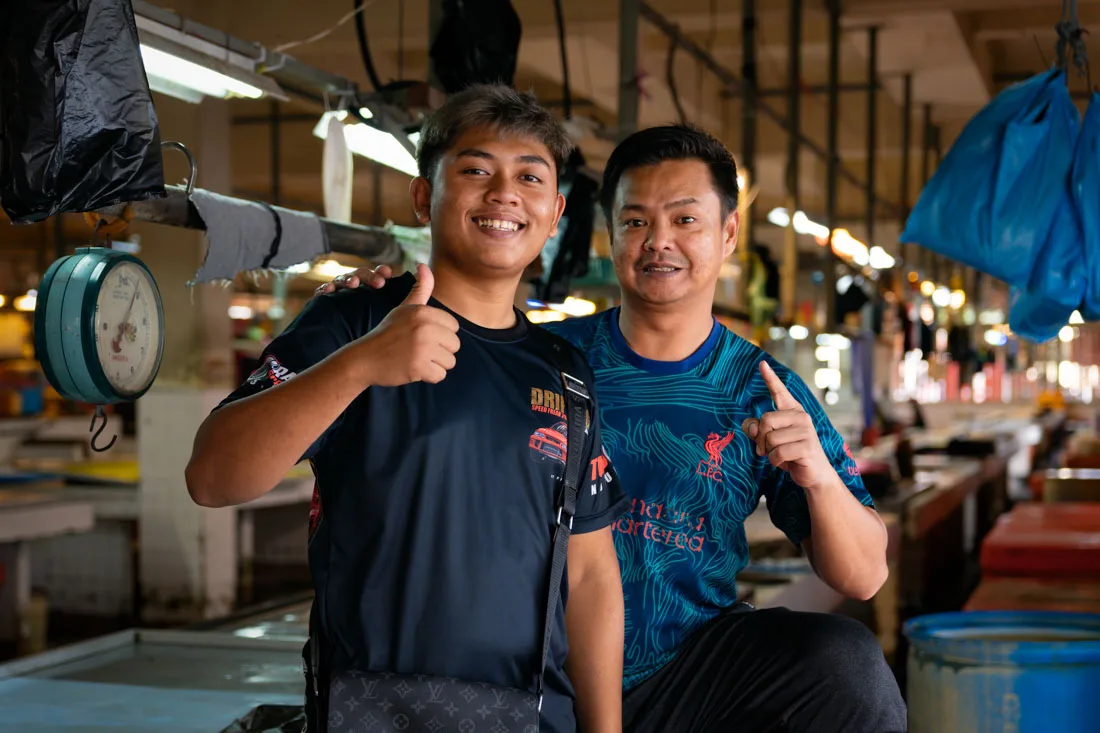 Locali amichevoli al mercato del pesce.