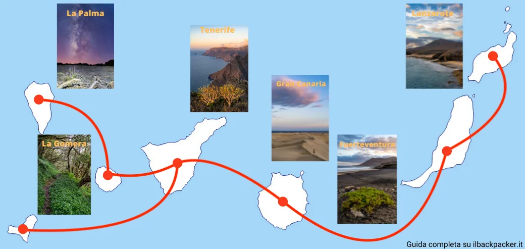 On the other hand, for those who have in mind a multi-island trip, or perhaps the entire archipelago, the itinerary I recommend following for ease of travel is the one you see roughly in the map below; by doing so, you never have to retrace your steps and can simply continue your journey from island to island westward starting from Lanzarote. Finally, I remind you that the direct connections by ferry and plane to El Hierro are exclusively from Tenerife so plan accordingly.